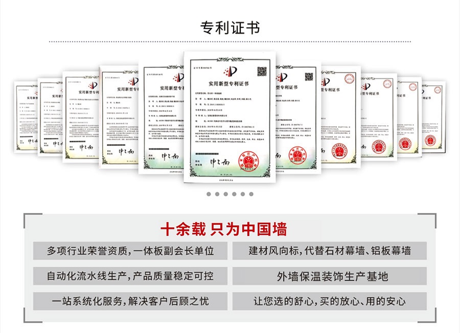 寶潤達(dá)在保溫裝飾一體板領(lǐng)域的優(yōu)勢,不僅僅只是建立在現(xiàn)代化的生產(chǎn)車間、先進(jìn)的制造工藝、卓越的產(chǎn)品性能上。寶潤達(dá)自1996年涉足外墻裝飾領(lǐng)域以來,積累了24年的行業(yè)經(jīng)驗(yàn),擁有一支行業(yè)高水準(zhǔn)的設(shè)計(jì)、安裝施工隊(duì)伍,真正具備集產(chǎn)品、設(shè)計(jì)、施工為一體,打造精品工程的能力。只要您給寶潤達(dá)參與的機(jī)會,我們就有十足的信心向您提供放心的系統(tǒng)化解決方案。