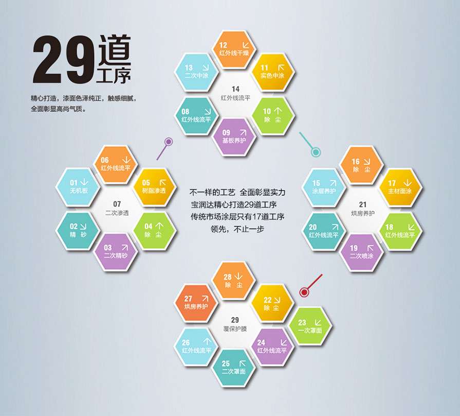 色彩統(tǒng)一 寶潤達(dá)擁有系統(tǒng)化的色彩控制方案 完美的原材料供應(yīng)保障 40噸單缸產(chǎn)能 專業(yè)化的產(chǎn)品涂裝技術(shù) |